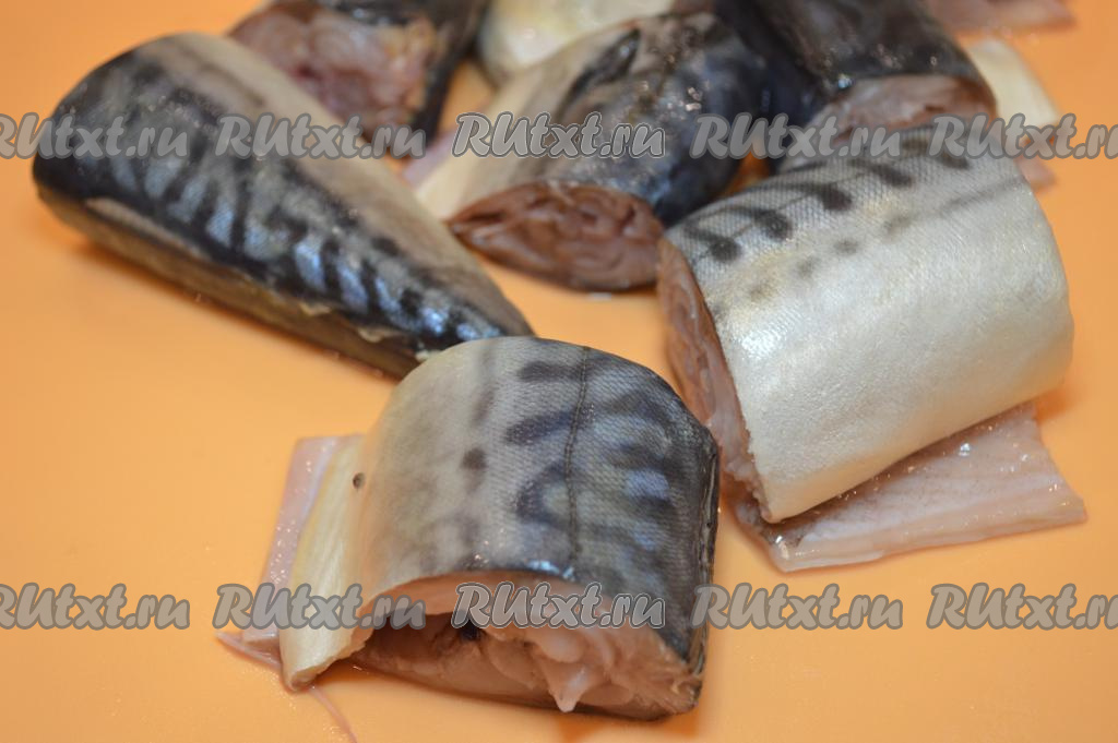 У скумбрии отрезать голову и плавники, удалить внутренности и очистить от чёрной плёнки брюшки рыбок. Тщательно вымыть рыбу и нарезать на порционные кусочки, поперчить (можно добавить и другие специи по вкусу), посолить и оставить минут на 10 (пока обжариваются овощи). За это время кусочки скумбрии пропитаются специями.