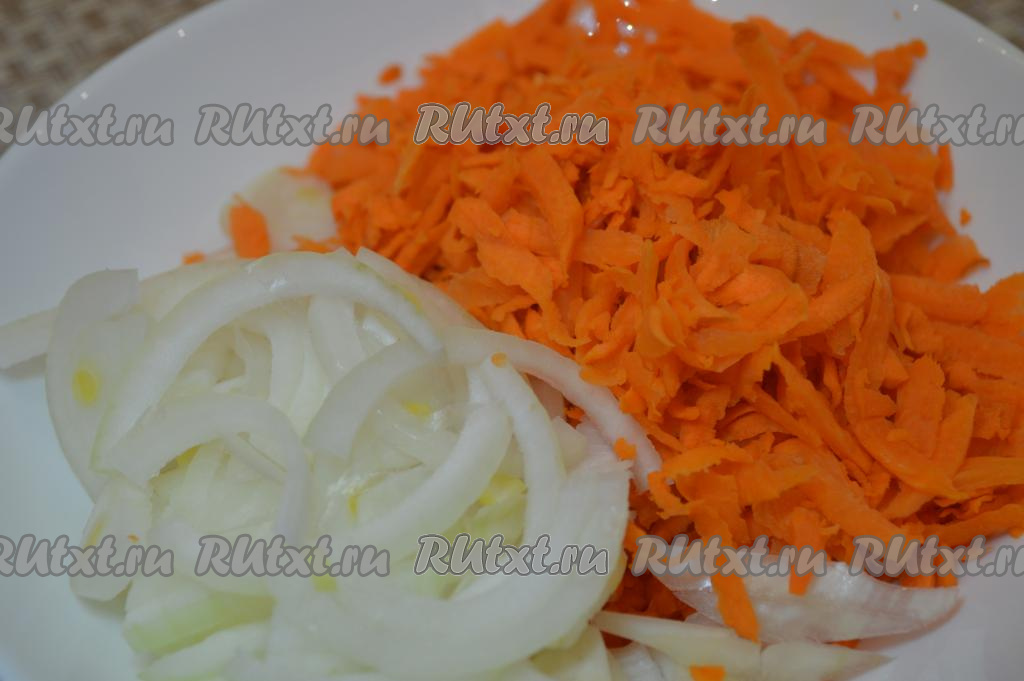 Почистить лук и нарезать на тонкие перья. Почистить морковь, а затем натереть на крупной тёрке.