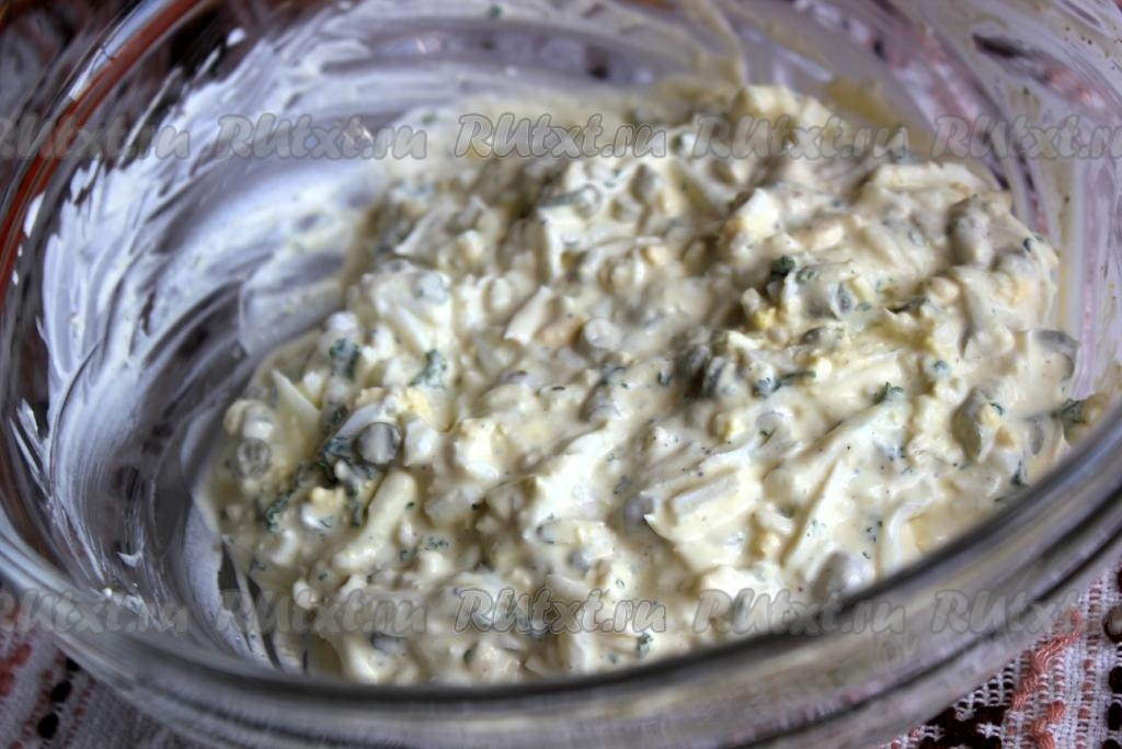 По желанию и по вкусу можно посыпать молотым душистым перцем, затем соус из сметаны и яиц тщательно перемешать.