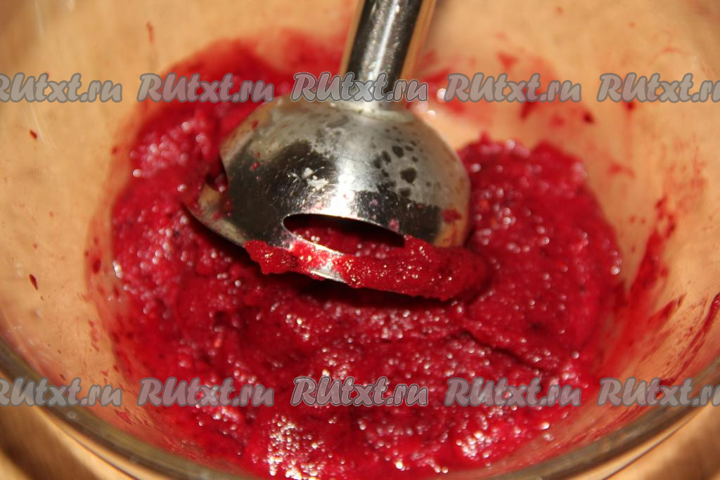 Для приготовления заварного крема можно использовать свежие ягоды или замороженные, предварительно разморозив их и слив лишнюю жидкость. Ягоды выложить в миску и пюрировать с помощью погружного блендера.