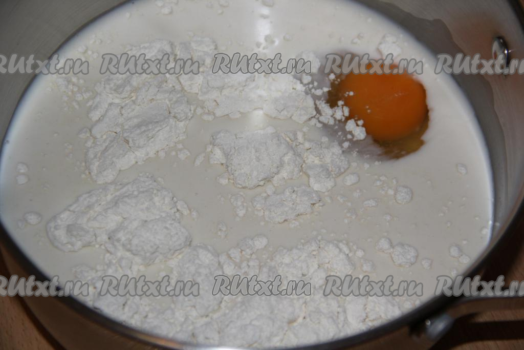 В толстостенную кастрюлю влить молоко и добавить яйцо.