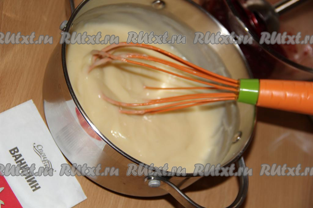 При непрерывном перемешивании венчиком довести содержимое кастрюли до кипения. Затем варить заварной крем, не переставая помешивать, на небольшом огне в течение 3 минут. Снять кастрюлю с огня, добавить ванильный сахар, перемешать.