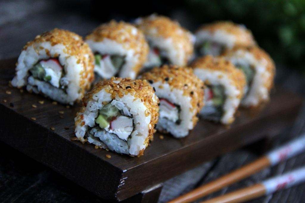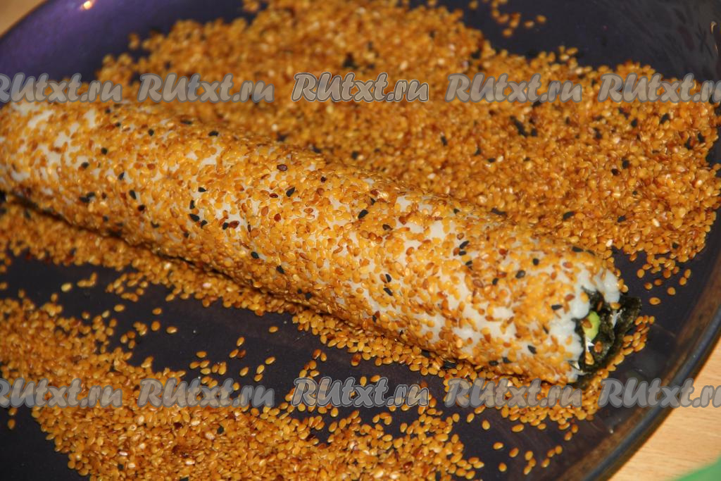 Кунжут высыпать на плоскую тарелку и обвалять получившийся ролл в кунжуте.