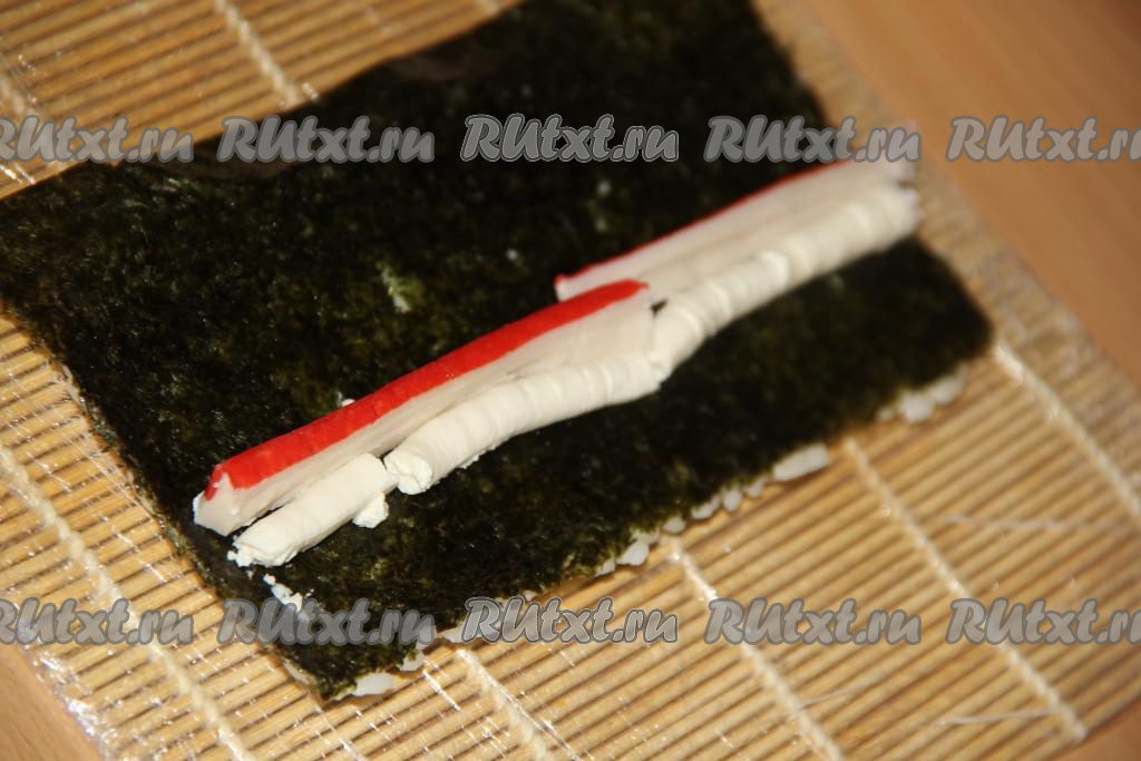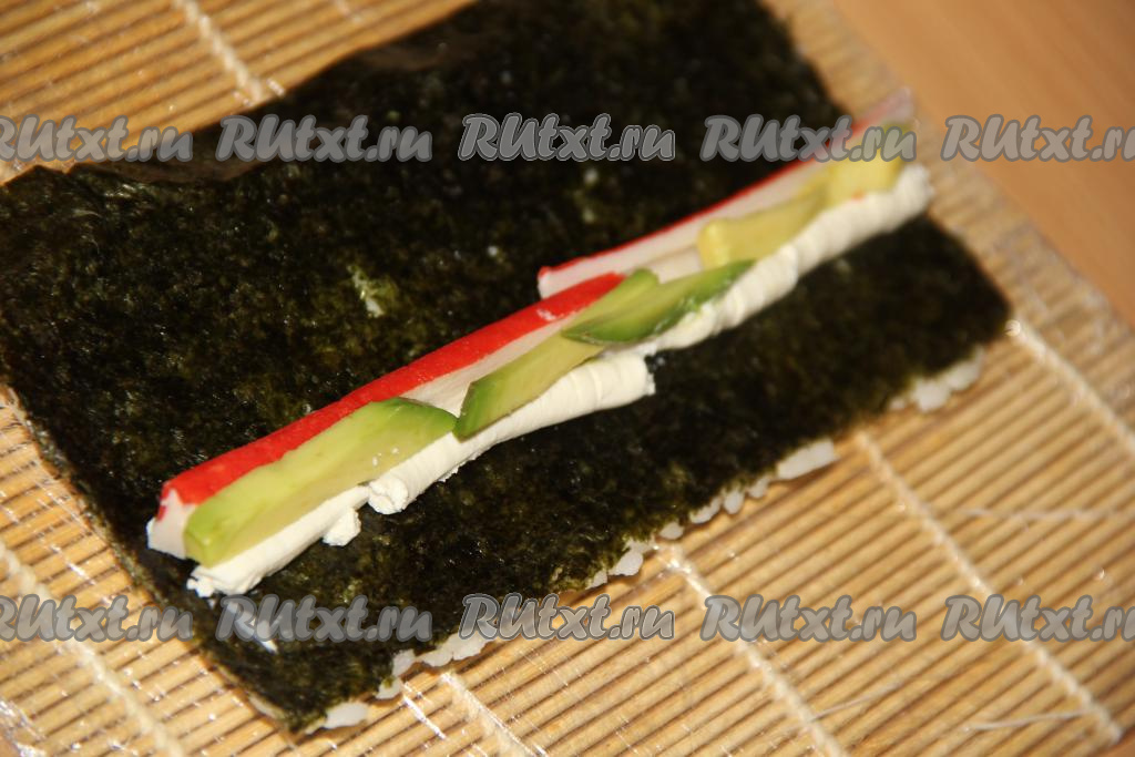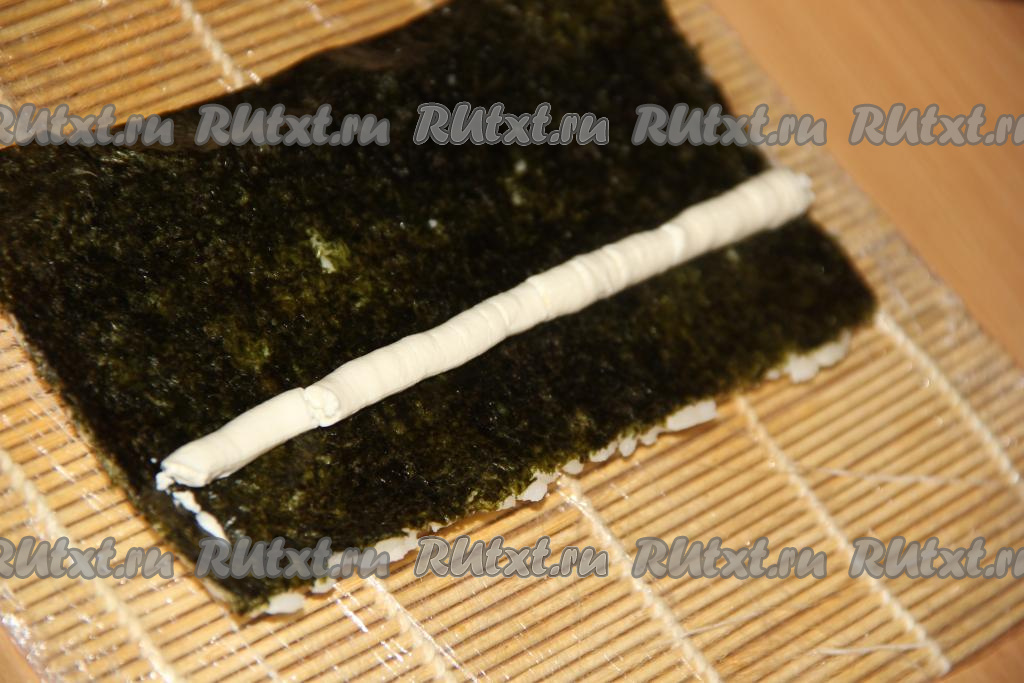 Перевернуть лист рисом вниз. Творожный сыр, поместив в кулинарный мешок, отсадить ровной полоской на нори, отступив пару сантиметров от края листа. Сыр нужно размещать с противоположной стороны от края, на обратной стороне которого нет риса.