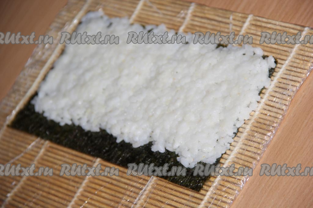 На циновку выложить половинку листа нори блестящей стороной вниз. Смоченными в воде руками выложить рис на лист нори, равномерно распределить, оставляя, один край нори (примерно, 1 см) свободным (как на фото).