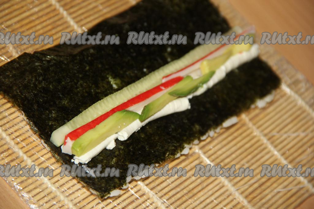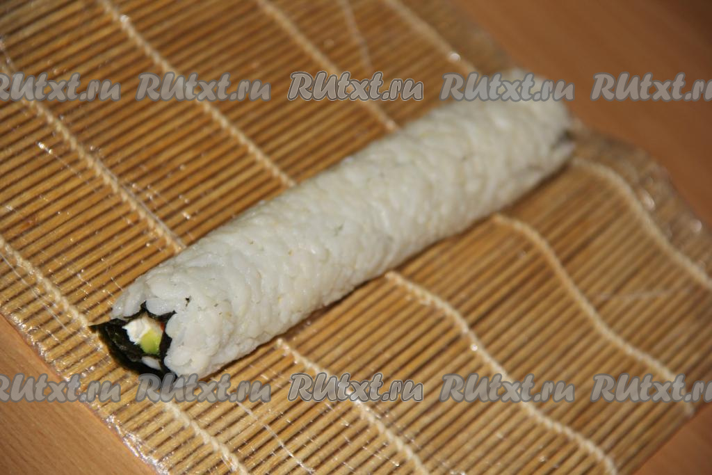 Начиная с края, ближе к которому выложен творожный сыр, свернуть с помощью циновки плотный ролл (слой риса у нас окажется снаружи).
