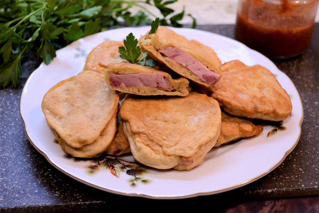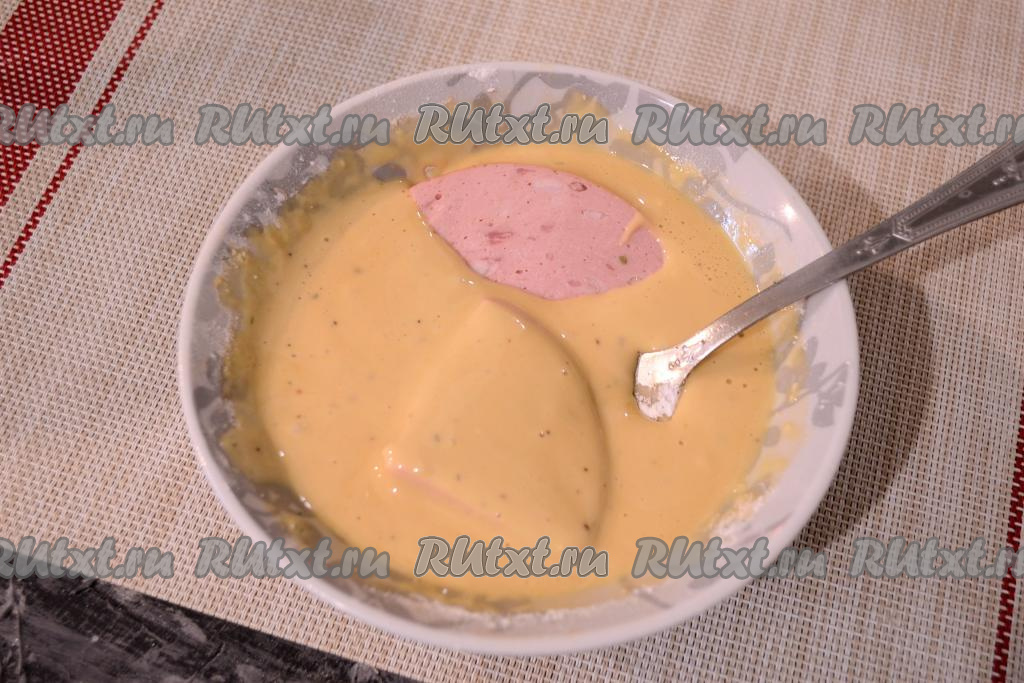 Попробуйте кляр на соль, если её недостаточно - добавьте по вкусу. Каждый кусок колбасы полностью окунуть в кляр.