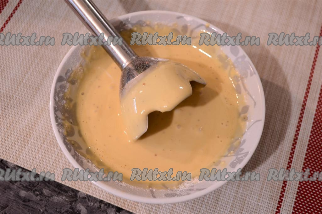 Далее взбить кляр погружным блендером для удаления мелких комочков муки. Муки может понадобиться больше или меньше, смотрите сами - кляр должен быть похожим по консистенции на хорошую сметану.