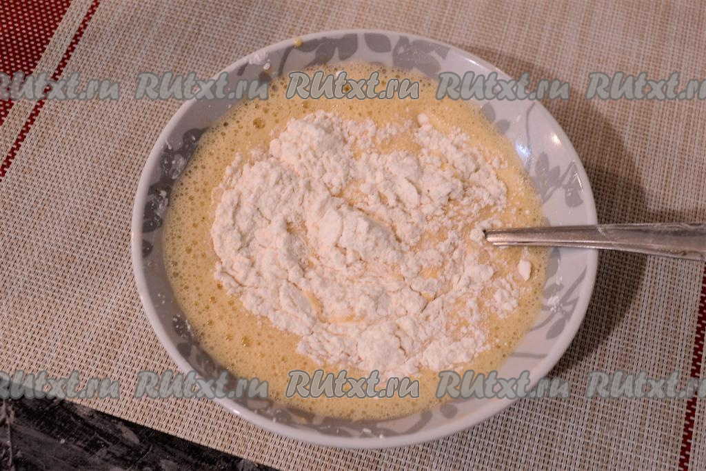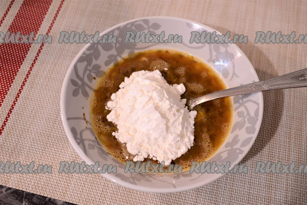 Хорошо вилкой расколотить яичную смесь, всыпать крахмал.