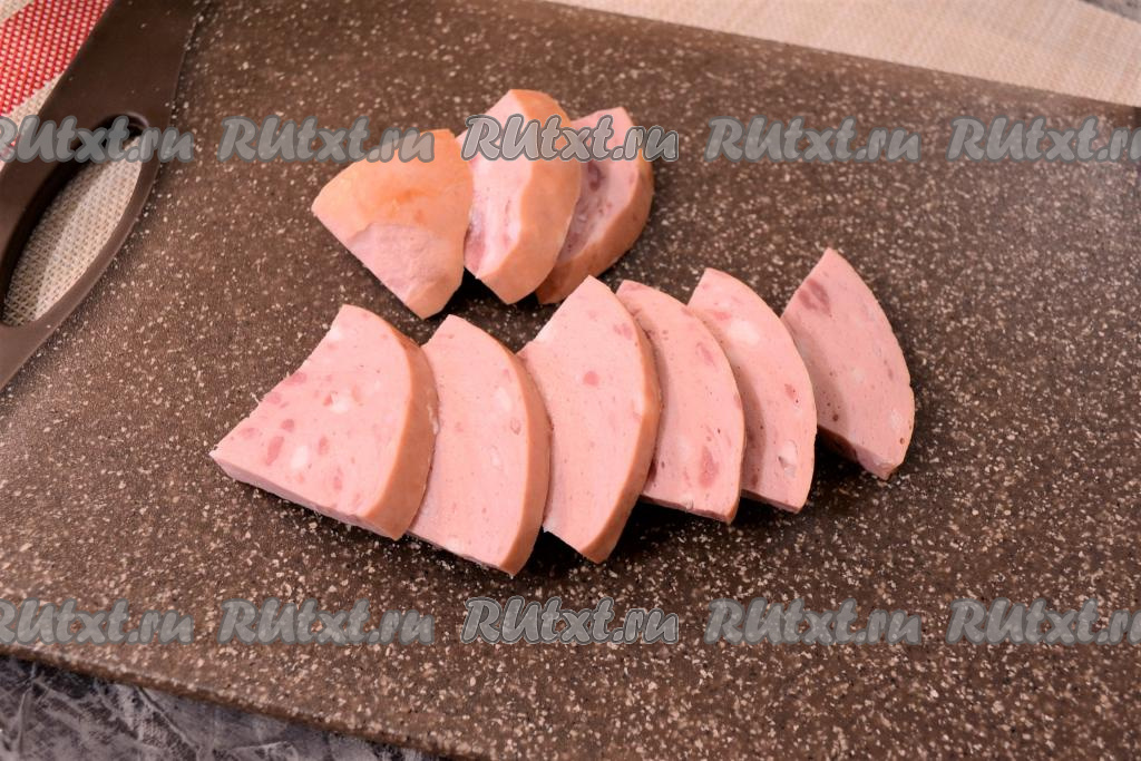 Колбасу нарезать довольно крупными и толстыми кусочками.