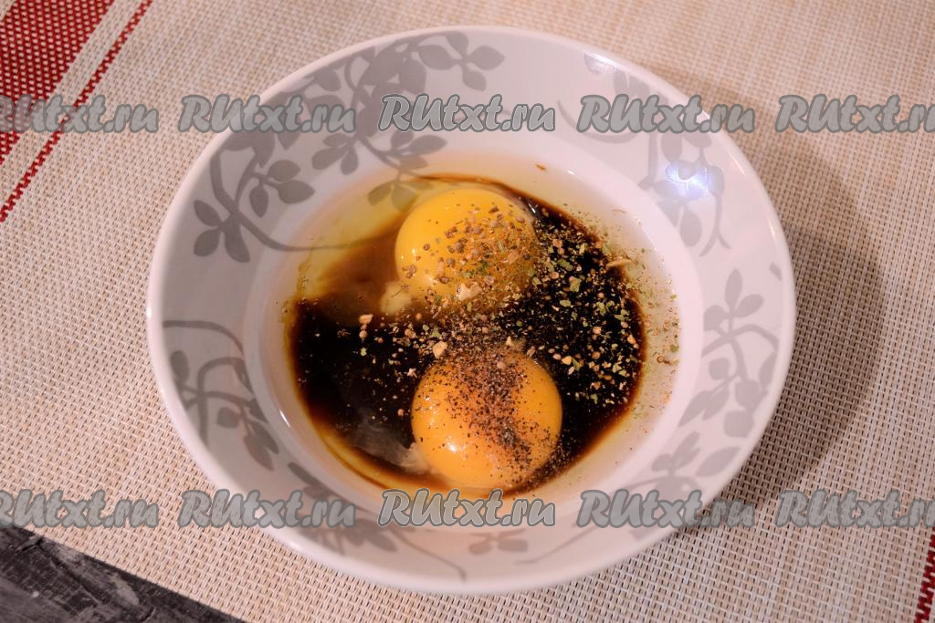 Яйца разбить в миску, влить соевый соус, добавить перец и специи.