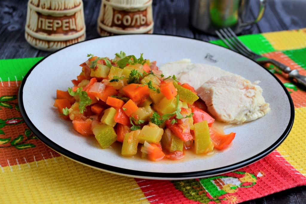 Овощное рагу, приготовленное с кабачками, перцем и помидорами, получается очень вкусным, насыщенным и полезным, попробуйте! Подавать его можно и в тёплом, и в охлаждённом виде с курицей, рыбкой или мясом.