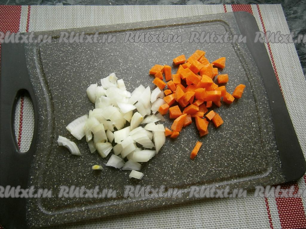 Лук, чеснок и морковь очистить, удалить плодоножку с семенами из болгарского перца. Нарезать морковь с луком небольшими кубиками.