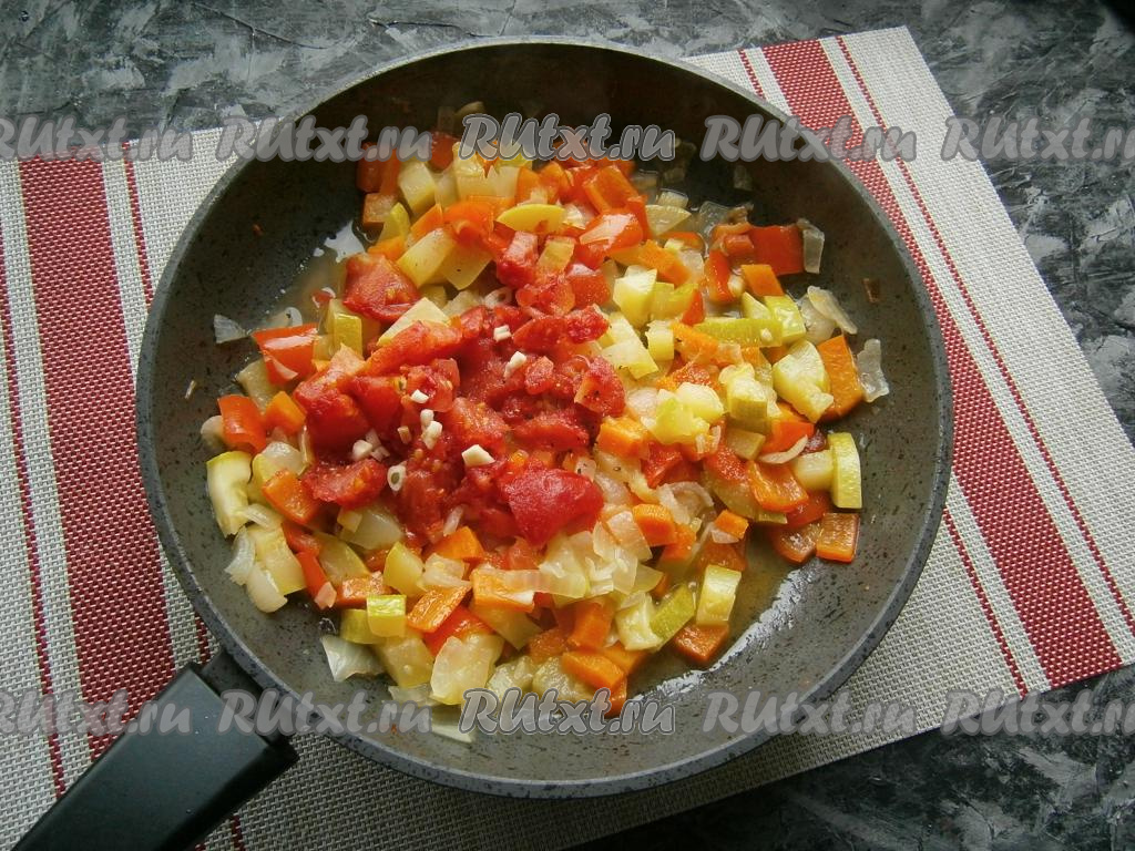 Через 15 минут добавить к овощам помидоры и мелко нарезанный чеснок, перемешать и протушить рагу на небольшом огне ещё 3-4 минуты.