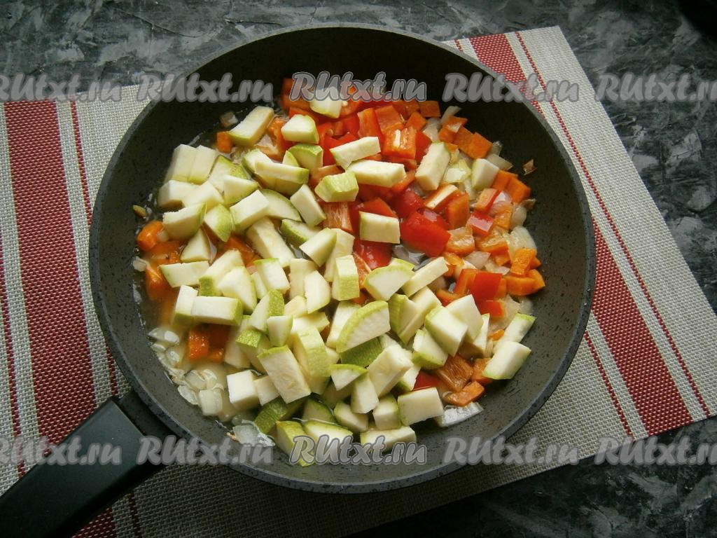 На кубики чуть большего размера нарезать болгарский перец и кабачок (если кабачок молодой, его можно готовить вместе с кожурой).