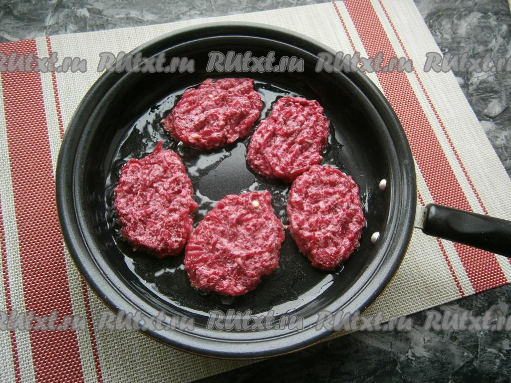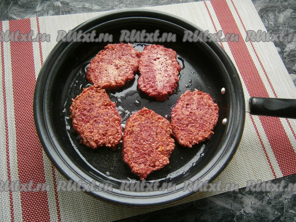 Сковороду разогреть с растительным маслом. Выкладывать свекольную массу в сковороду ложкой в виде небольших котлет, аккуратно их разравнивая.