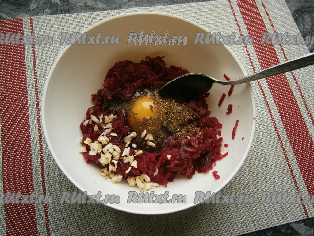 Натереть свеклу на крупной тёрке, добавить соль, хмели-сунели, молотый чёрный перец, яйцо и мелко нарезанный чеснок.