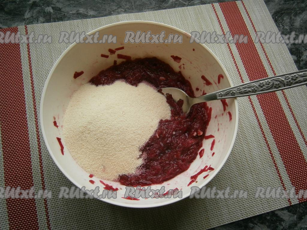 Перемешать свекольную массу и всыпать манную крупу.