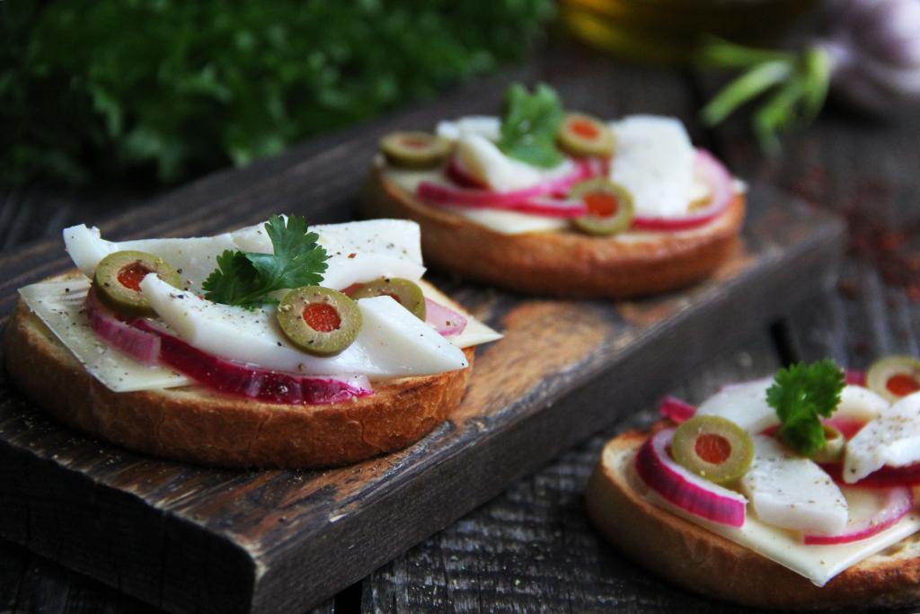 Оливки нарезать тонкими кружочками и выложить на бутерброды.