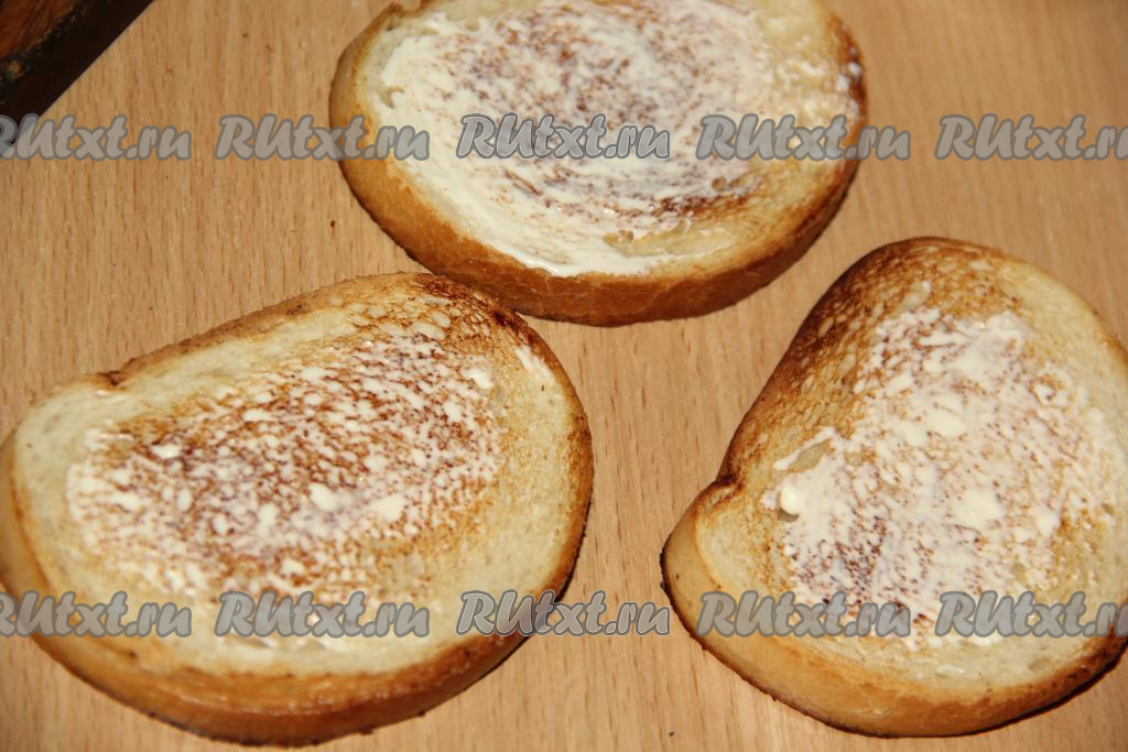 Кусочки белого хлеба намазать с двух сторон сливочным маслом.