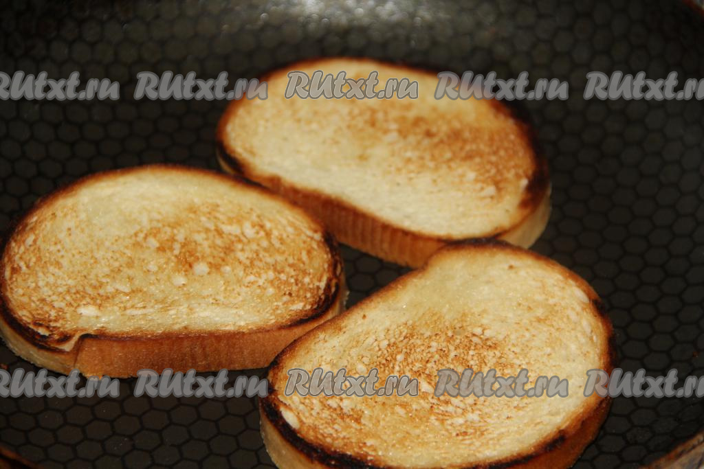 Обжарить хлеб с двух сторон до золотистого цвета на сухой сковороде.