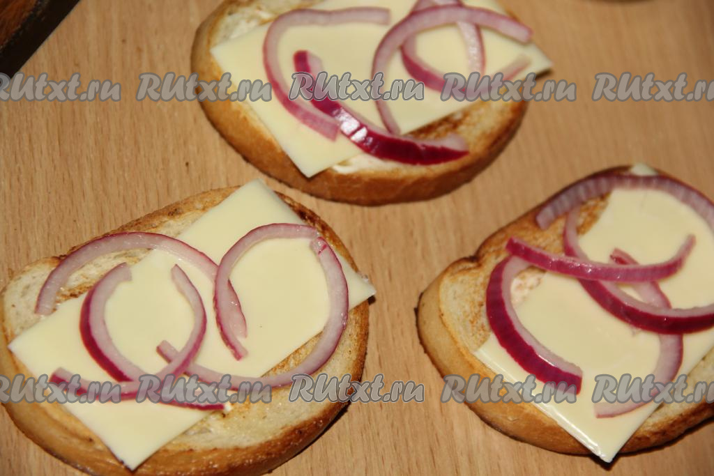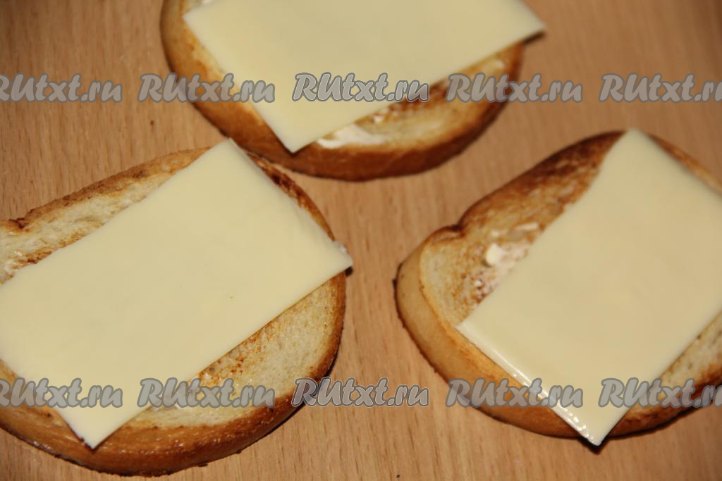 Собрать бутерброды, для этого на каждый обжаренный и остывший кусочек белого хлеба нужно выложить ломтик сыра.