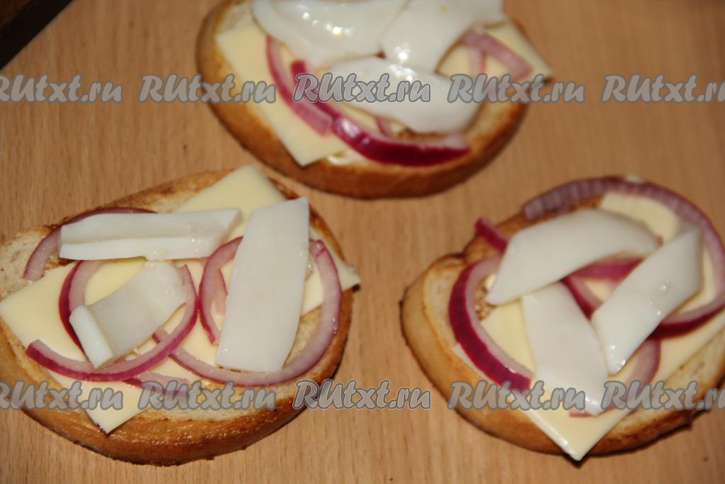 Поверх сыра разложить полукольца маринованного лука.