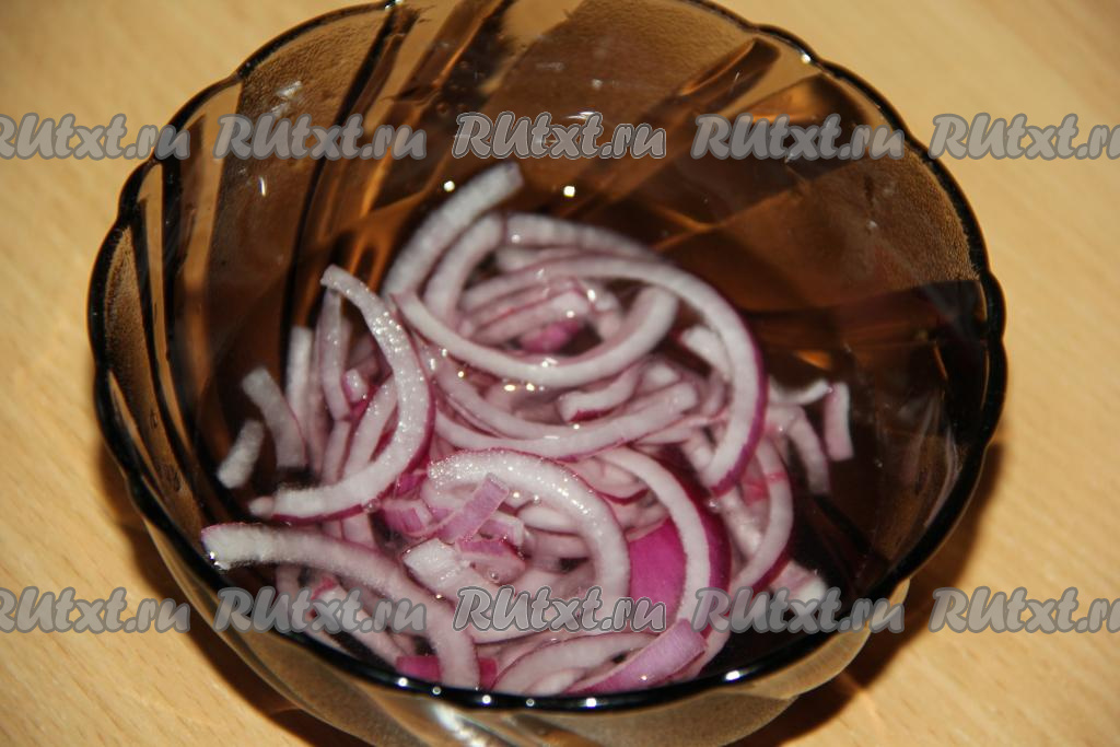 Готовые гренки остудить. Лук очистить и нарезать тонкими полукольцами (или кольцами). Для приготовления маринада смешать 2 столовые ложки воды, 2 столовые ложки уксуса 9% и половину чайной ложки сахара. В получившийся маринад выложить нарезанный лук и дать ему промариноваться в течение минут 30, а затем откинуть на дуршлаг.