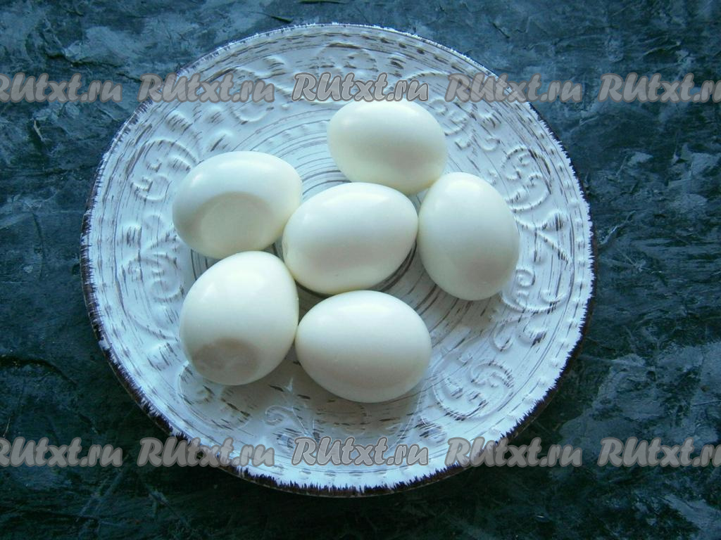 Яйца отварить в кипящей воде около 10 минут, остудить их в холодной воде и очистить.