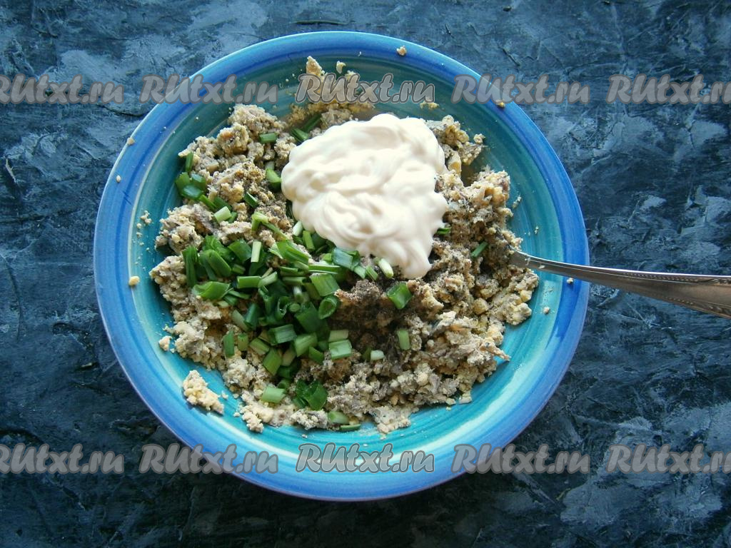 Теперь хорошенько желтки со шпротами размять той же вилкой, добавить соль и чёрный молотый перец по вкусу, нарезанный зелёный лук и майонез, перемешать начинку для фарширования яиц.