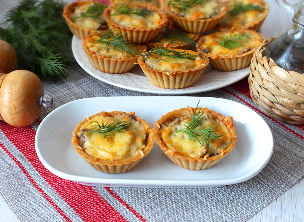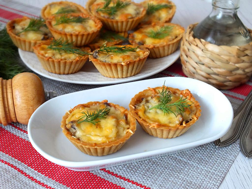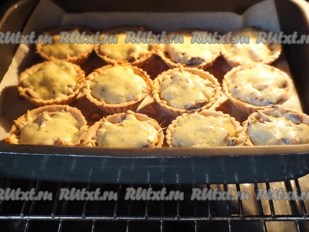 Через указанное время достаньте форму (или противень) с грибным жульеном в тарталетках. Сыр должен слегка зарумяниться.