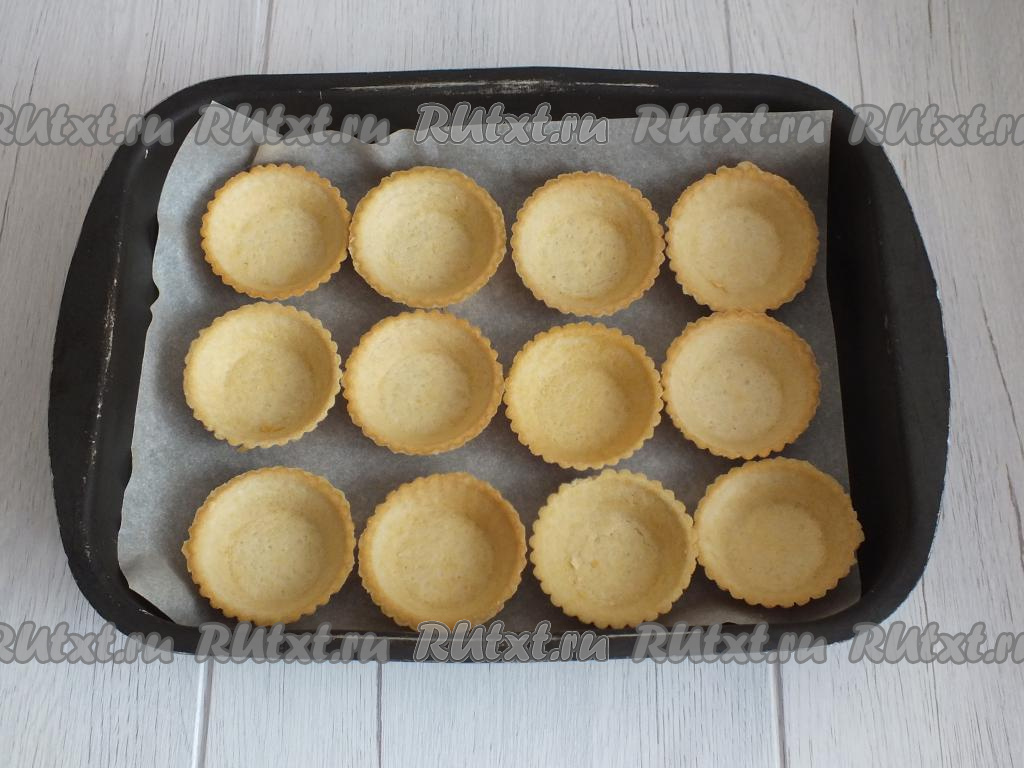 Включите духовку на 200 градусов. Возьмите форму (или противень), застелите пергаментом. Разложите тарталетки.