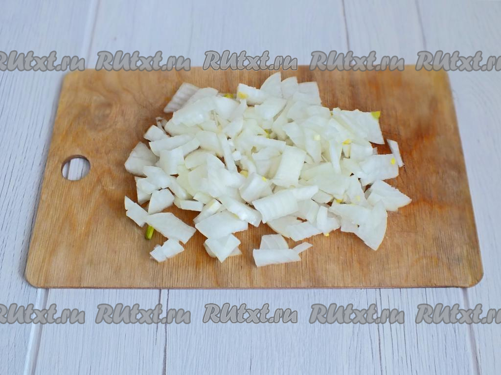 Приготовление грибной начинки, которой будут наполняться тарталетки, начните с обжаривания лука. Для этого луковицу очистите, нарежьте на небольшие кусочки.