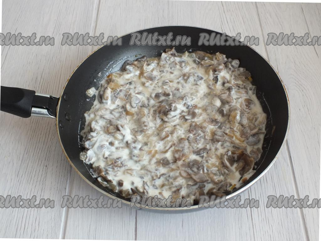 Не снимая с плиты сковороду, добавьте к грибам соль и чёрный молотый перец по вкусу, сметану, перемешайте и прогревайте в течение 5 минут, затем снимите с огня и дайте грибной начинке немного остыть.