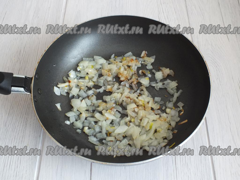 В сковороде разогрейте растительное масло, убавьте огонь до среднего и выложите лук. Обжаривайте, иногда помешивая, до прозрачности лука и появления лёгкой румяной корочки.