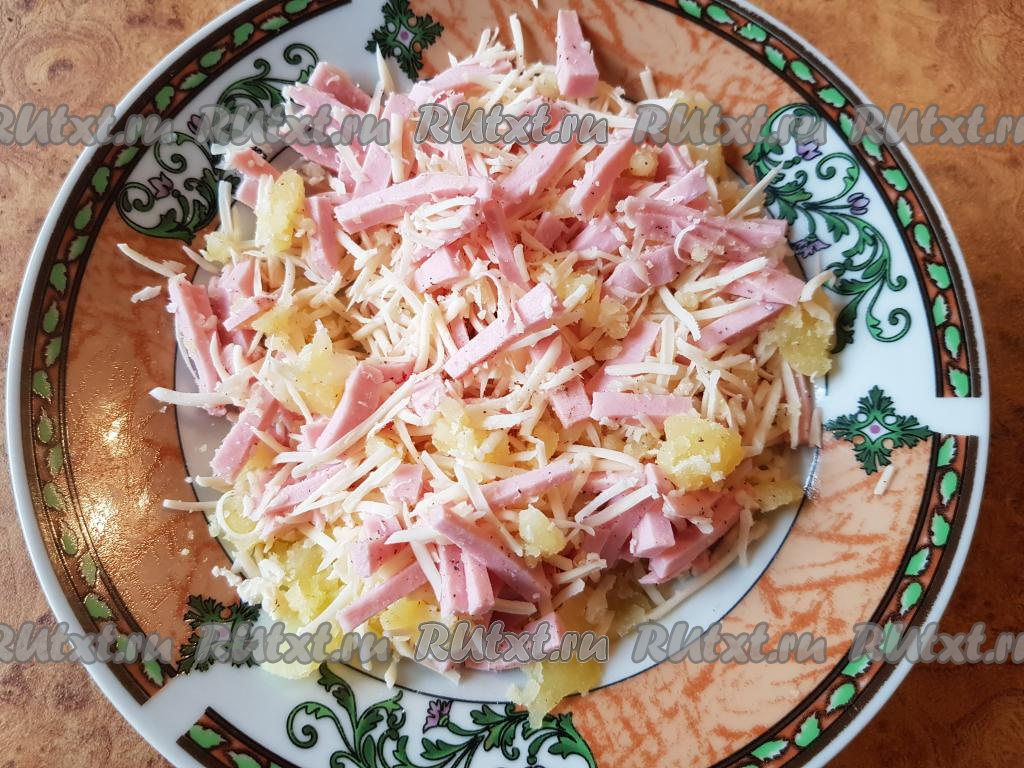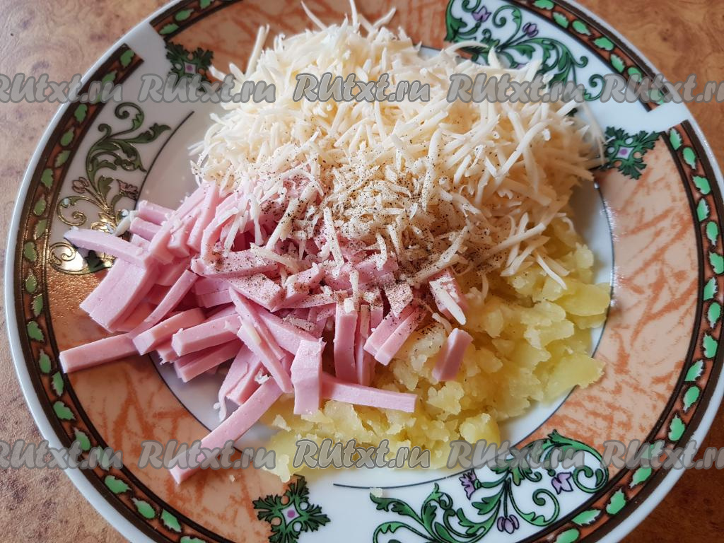 Хорошо перемешать мякоть картошки с колбасой и сыром.