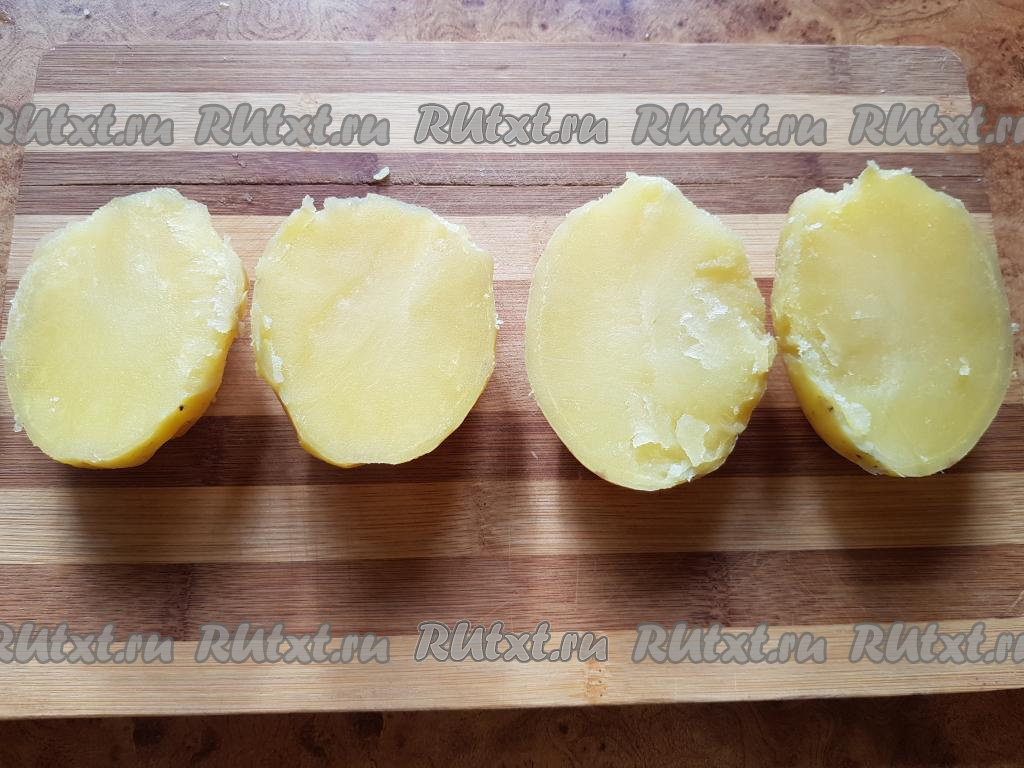 Картофель, не очищая от кожуры, отварить в слегка подсоленной воде до готовности (варить минут 25-30 с момента закипания воды). Затем картошку остудить, очистить и разрезать пополам.