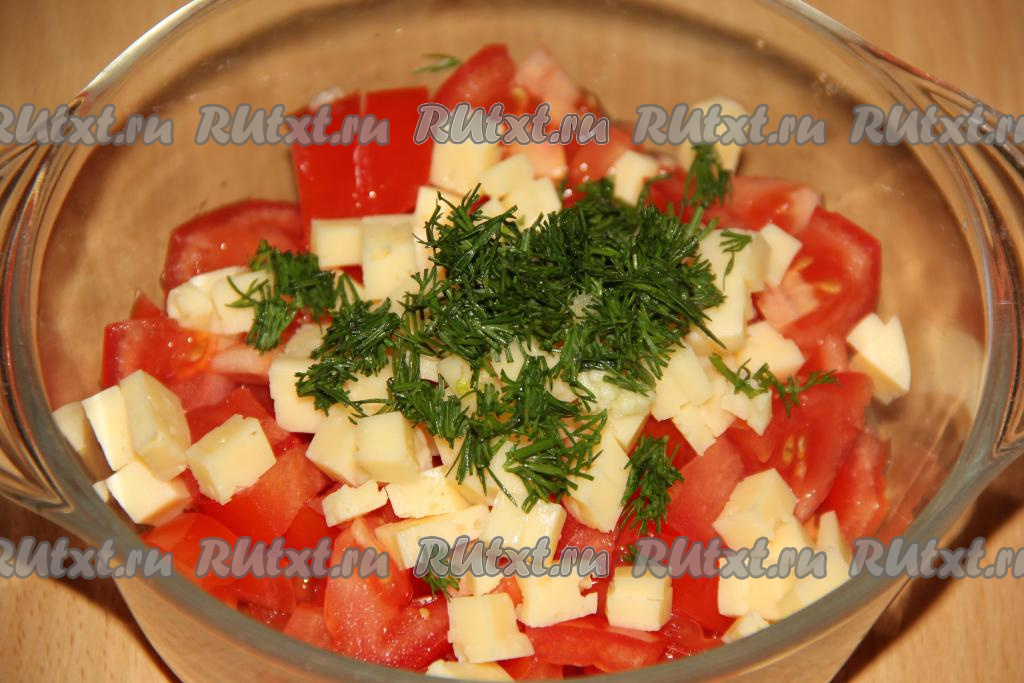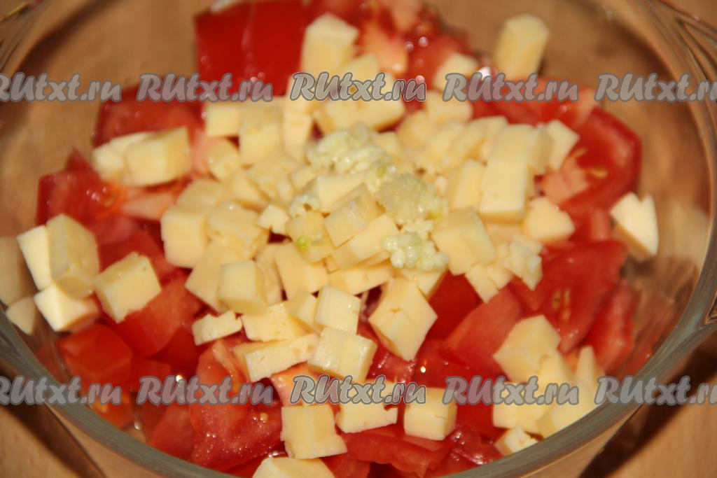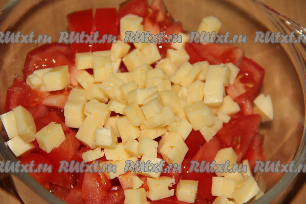 Сыр нарезать на мелкие кубики и добавить к помидорам.