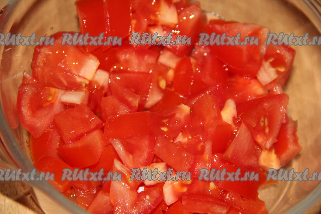 3 крупных помидора вымыть и нарезать на кубики среднего размера.