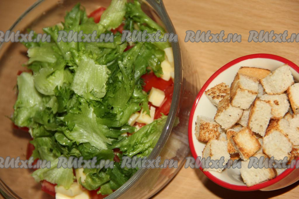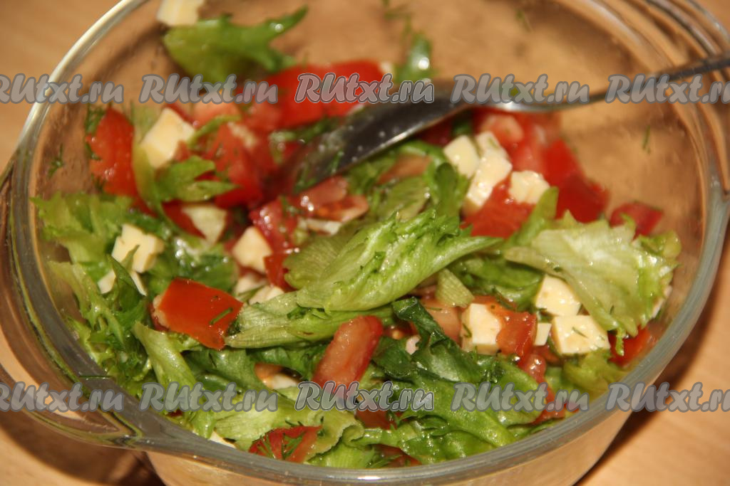 Вымыть и обсушить листья салата, а затем порвать руками и добавить в салат из помидоров, сыра и чеснока.