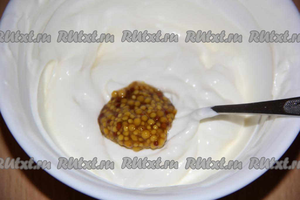 Для приготовления заправки соединить зерновую горчицу и сметану, перемешать.