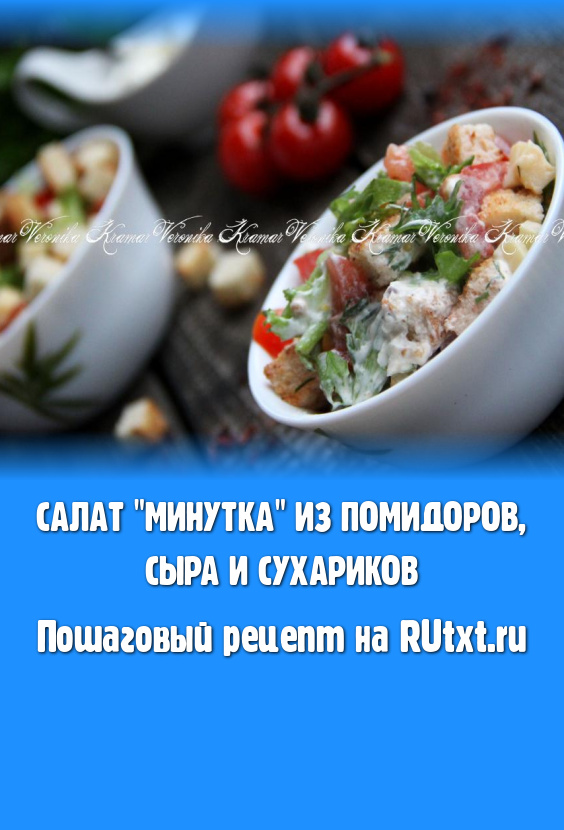 В яркий, сочный салат "Минутка", приготовленный из помидоров, сыра, зелени и чеснока, добавить заправку и сухарики, перемешать и сразу подать к столу. Этот вкусный салатик прекрасно разнообразит повседневное меню и порадует замечательным вкусом всю семью!