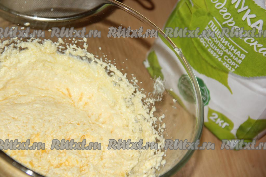 Понемногу всыпать в получившуюся массу просеянную муку, замешивая тесто.