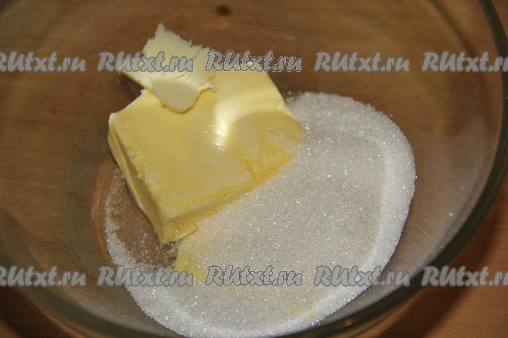 Для приготовления этого печенья понадобится 100 грамм мягкого сливочного масла, поэтому заранее достаньте его и дайте полежать немного при комнатной температуре. Когда масло размягчится, всыпьте к нему сахар.