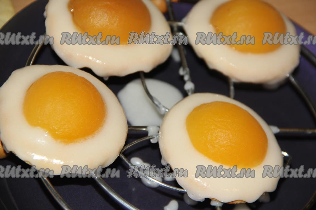 Печенье выложить на решётку, каждую печенюшку полить 1-2 чайными ложками глазури. Равномерно распределить глазурь по поверхности печенья. Глазурь должна стекать и закрыть бока печенюшек. На каждое печенье поверх глазури выложить дольку консервированного абрикоса и оставить до полного застывания глазури (примерно, на 1 час).