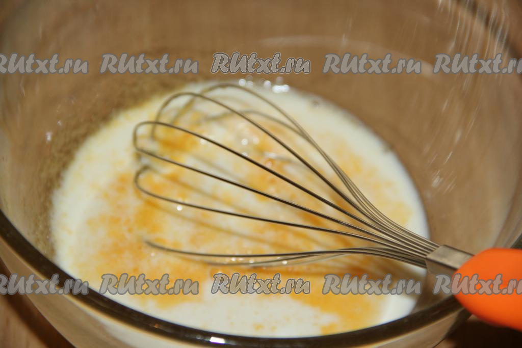 Венчиком перемешать желтки с сахаром, а затем влить молоко и снова перемешать.