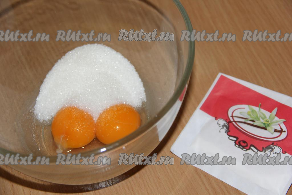 Яйца аккуратно разделить на белки и желтки. К двум яичным желткам всыпать сахар и ванильный сахар.