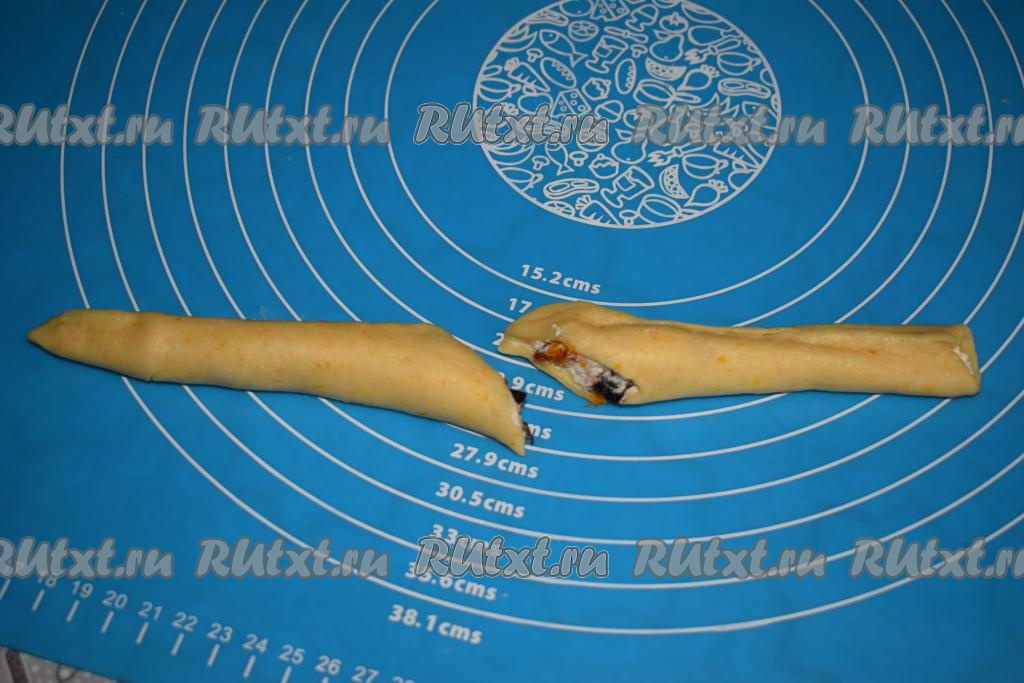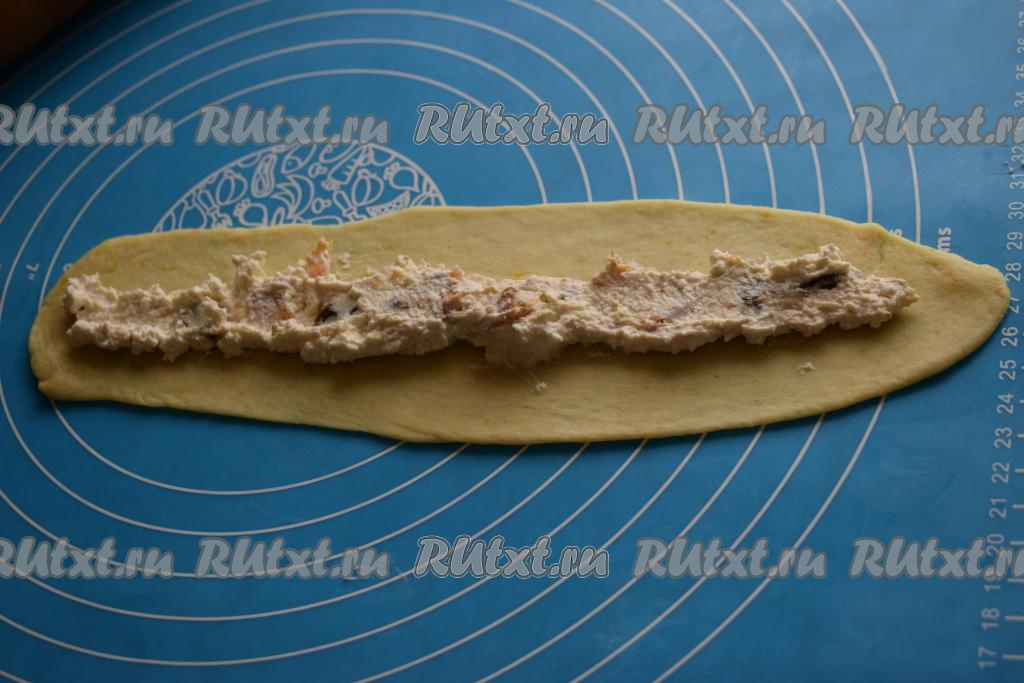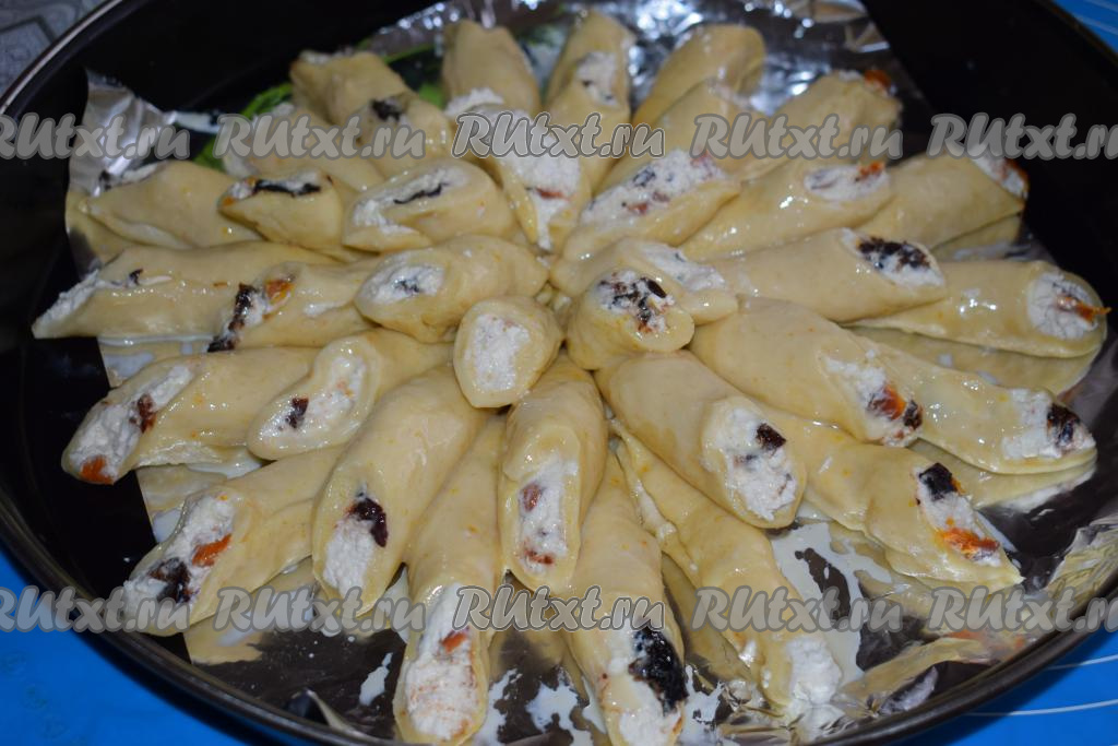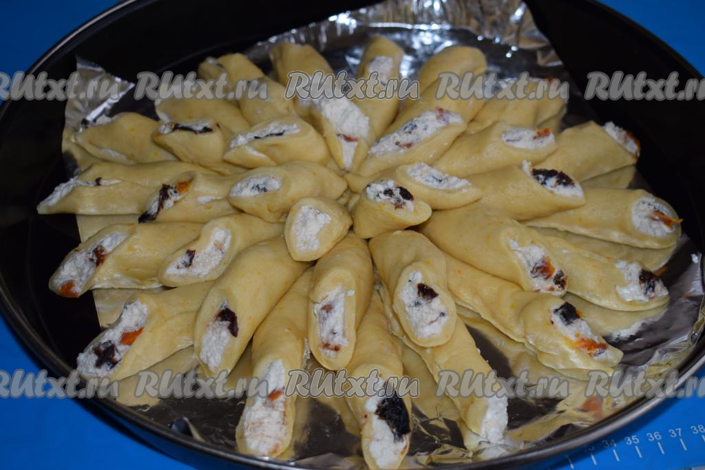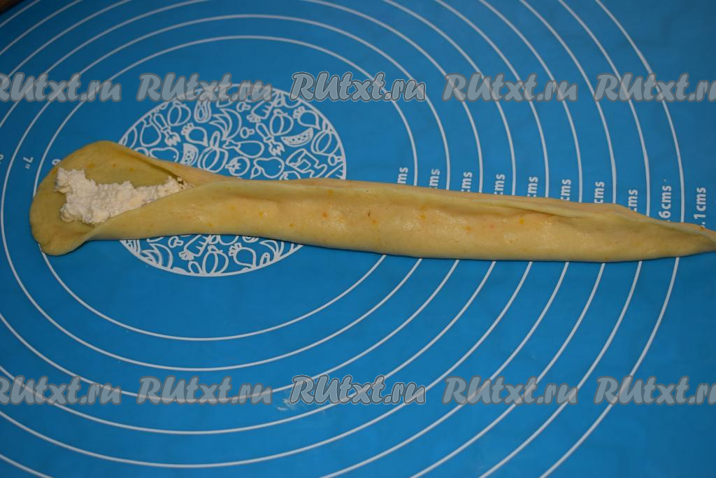 На середину овала выкладываем, примерно, 1 чайную ложку творожной начинки и защипываем края, формируя трубочку.