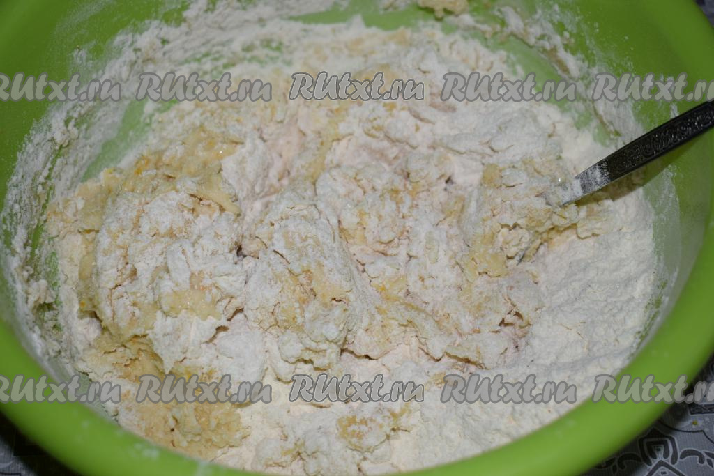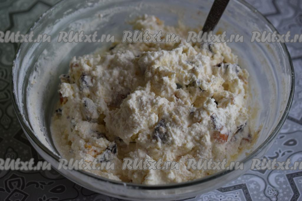 К творожной массе с сухофруктами добавим муку, перемешаем до однородности и наша начинка готова.