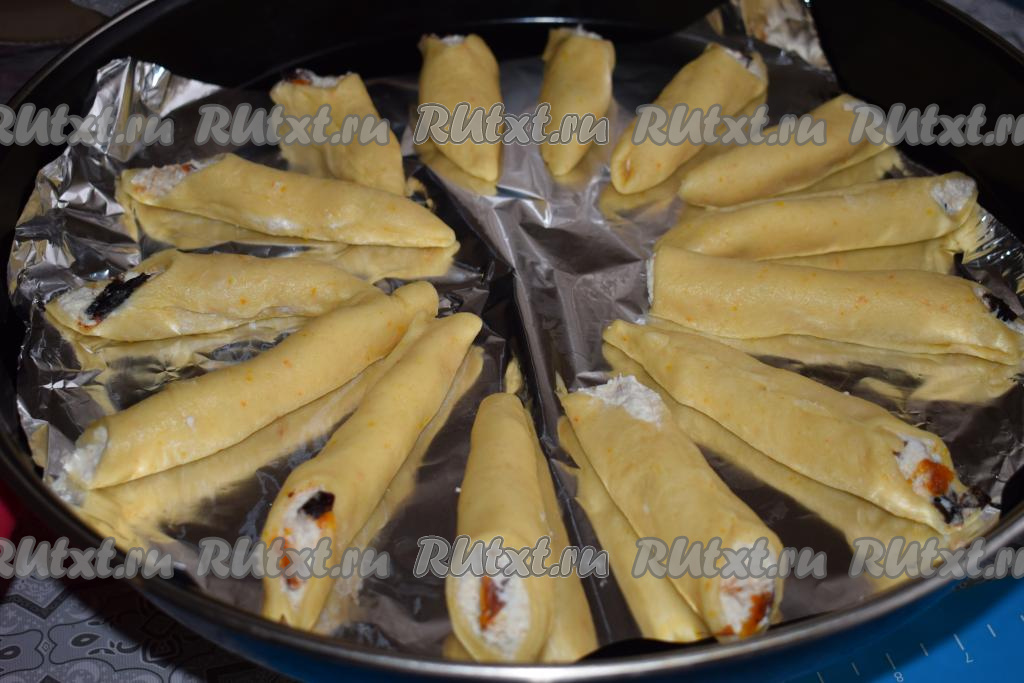 Форму диаметром 32 см застилаем фольгой (или пергаментом), выкладываем по кругу половинки трубочек, формируя внешний круг.